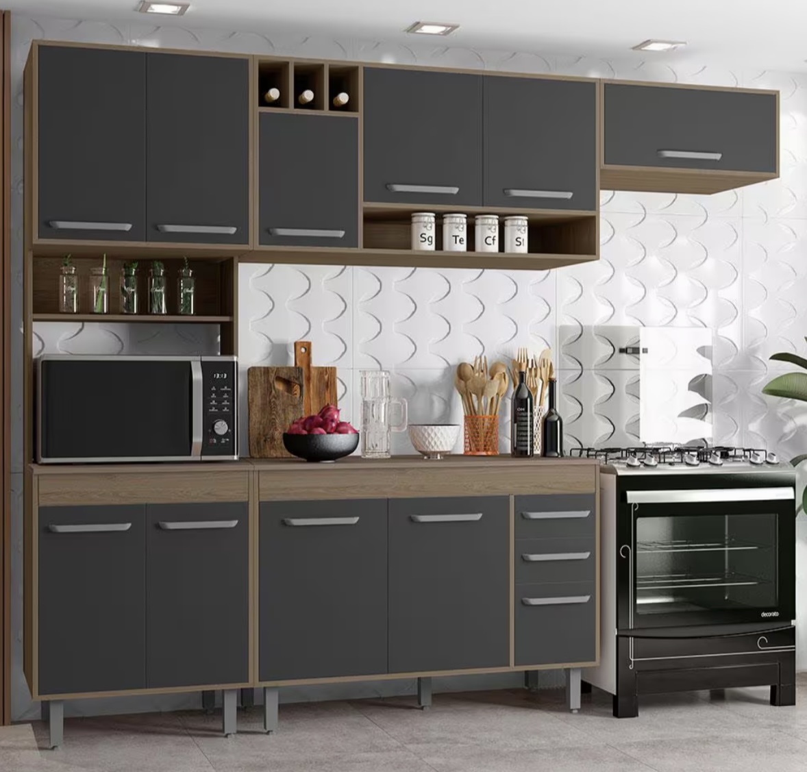 Produzida em MDP de alta qualidade com acabamento Perffect Touch, essa cozinha oferece amplo espaço interno, garantindo a organização eficiente de utensílios, eletrodomésticos e mantimentos.